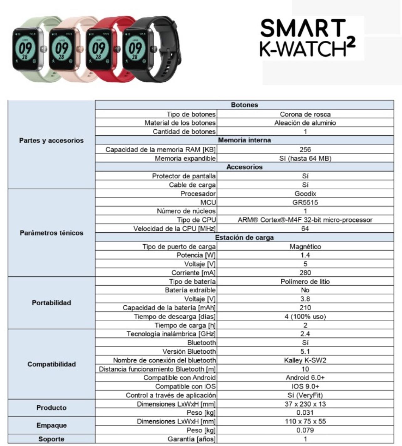¡Conoce el Smart K Watch 2 con pantalla táctil TFT de 1.5″, el compañero perfecto para que lleves contigo a todas partes! Supervisa el número de pasos, entrenamientos, sueño, frecuencia cardiaca, consumo de calorías, oxígeno en la sangre, estrés, frecuencia cardiaca y distancia. Este te brinda hasta 4 días de batería (dependiendo del uso) para que disfrutes al máximo. 4 diferentes colores, ligero y pequeño, ¡el reloj inteligente que estaba buscando! ¡Lleva el tuyo ahora!.Resistencia 5 ATM, úsalo en la ducha y en la piscina. Más de 10 diferentes modos deportivos. Monitorea tu sueño. Alerta y lectura de mensajes. Más de 100 diferentes fondos de pantalla.